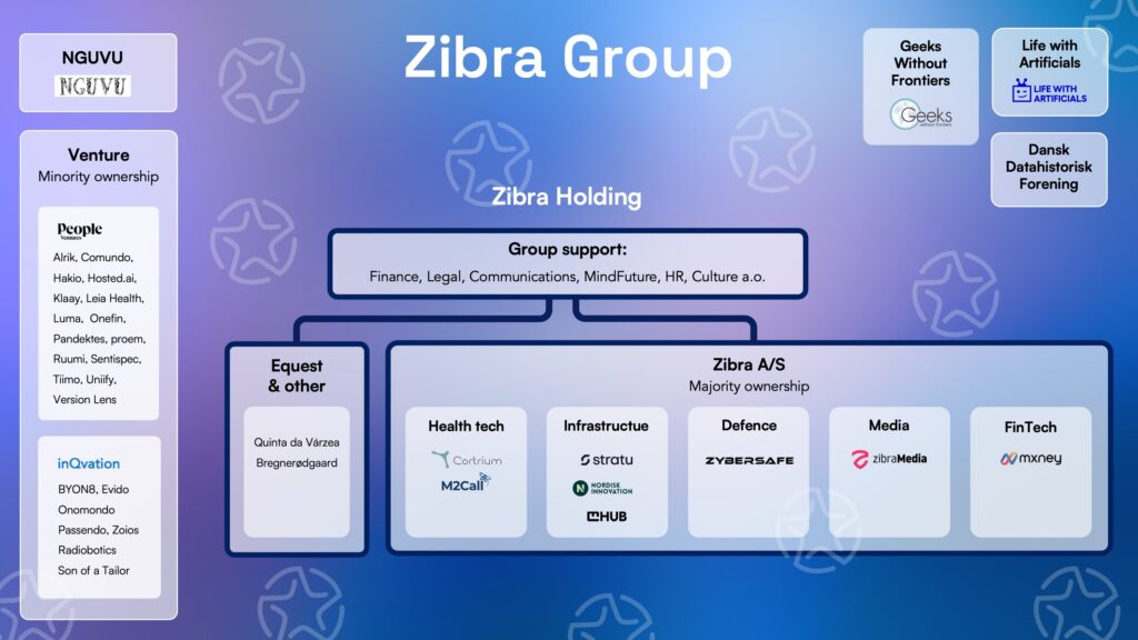 Zibra er paraplyorganisation for en række helejede og delvist ejede selskaber indenfor medie, IT- og teknologi-sektoren.